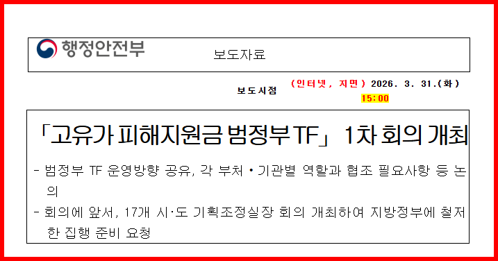 국무회의 의결 직후 행정안전부는 「고유가 피해지원금 범정부 TF」 1차 회의를 즉시 개최하며, 지원금의 신속한 지급 준비에 본격 착수했습니다.